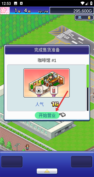 4、咖啡館建造完畢后,點擊開始營業(yè)按鈕,使咖啡館正式運營,以此吸引顧客,增加機場人氣與收益。