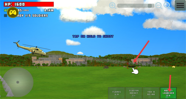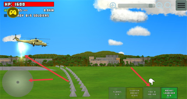 3、戰(zhàn)斗時用左下角搖桿控制直升機移動發(fā)射炮火,右上角HP條快沒就放誘餌彈引開導(dǎo)彈,看到士兵扎堆用CLUSTER ROCKET清場省火箭發(fā)射器彈藥。