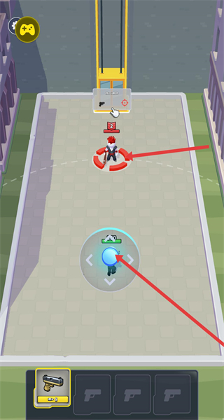 1、玩家開(kāi)局操控藍(lán)色小人往敵人方向移動(dòng),遇到紅帽子敵人邊退邊射控制距離躲避敵人的傷害。