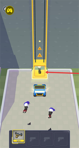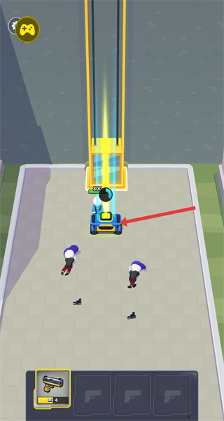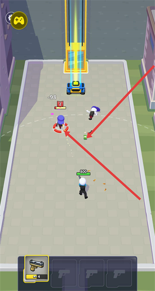 2、玩家需要利用手中的手槍精準(zhǔn)發(fā)射子彈繞場(chǎng)清紫帽子敵人,將越來(lái)越多的敵人全部消滅干凈。