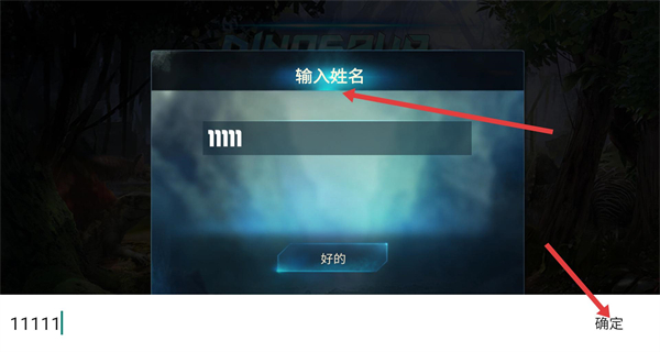 1、游戲初始在輸入姓名彈窗填寫?yīng)毺仃欠Q,確認無誤后點擊下方確定完成角色身份創(chuàng)建,這是進入恐龍冒險世界的第一步。