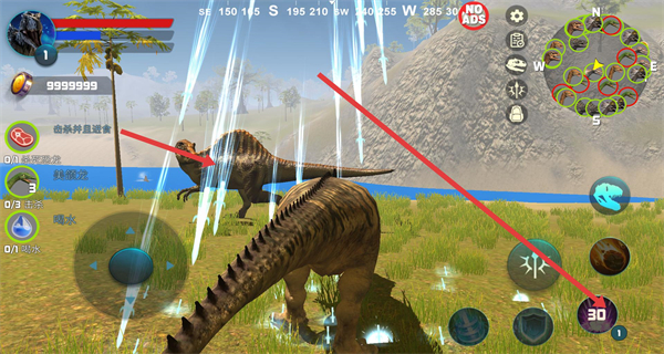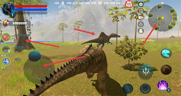 3、進入場景后依據(jù)界面箭頭指引關(guān)注任務(wù)提示追蹤目標,利用小地圖規(guī)劃路線朝著標記區(qū)域前進留意環(huán)境與恐龍分布。