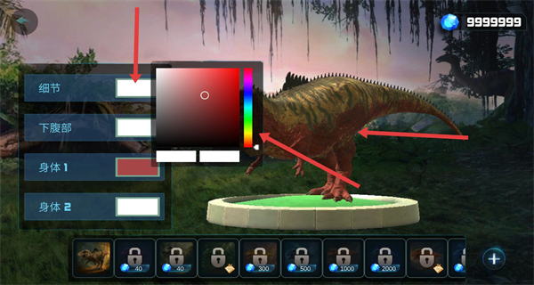 1、在恐龍養(yǎng)成界面點擊下方皮膚按鈕,進入恐龍外觀定制系統(tǒng),可對恐龍不同部位進行色彩等個性化設置。