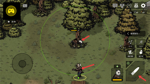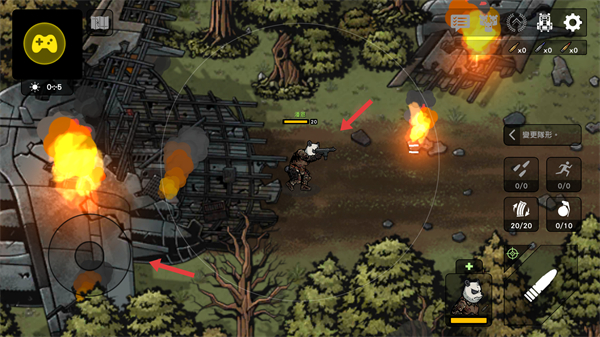 2、遭遇敵人時使用右側攻擊按鈕射擊瞄準敵人要害,同時關注自身生命值合理調整與敵人的距離確保有效攻擊。