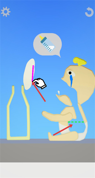 1、玩家在面對哭泣嬰兒時(shí)需要滿足他的要求,將白色圓形拖入瓶身組合成完整奶瓶滿足其喝奶需求通關(guān)。