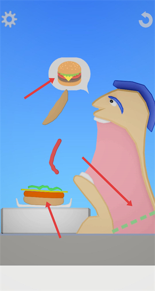 2、當(dāng)人物想吃漢堡把漢堡食材拖到對應(yīng)位置,拼接成完整漢堡送入其口中讓他飽餐一頓完成關(guān)卡。