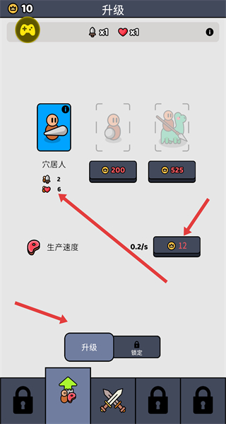 3、戰(zhàn)斗勝利能夠獲取金幣,進入升級頁消耗金幣提升穴居人屬性如生產速度數(shù)量,點擊升級強化單位戰(zhàn)力。