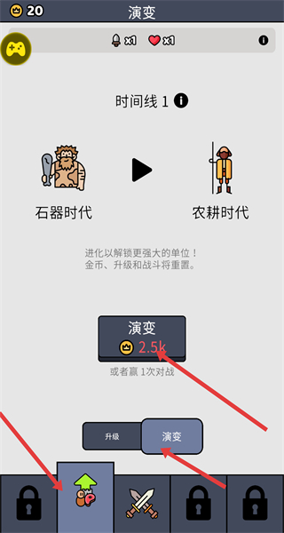 4、積累資源后進入演變界面,消耗2.5k金幣點擊演變從初始階段進化到農耕時代解鎖更強單位。