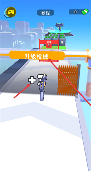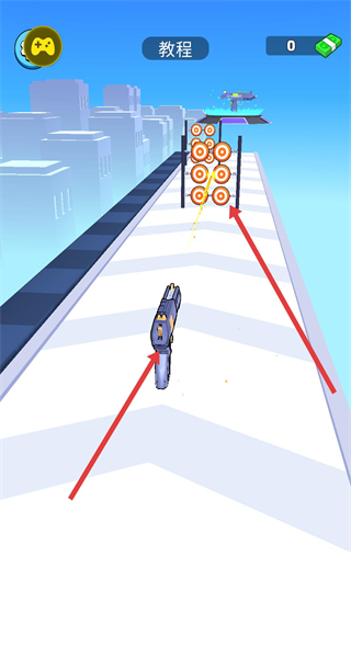 1、玩家進(jìn)入教程關(guān)需要操控槍支沿跑道前進(jìn),瞄準(zhǔn)前方橙色圓盤(pán)射擊熟悉射擊機(jī)制與移動(dòng)節(jié)奏。