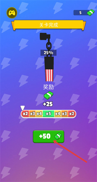 4、在關(guān)卡完成后可以領(lǐng)取25現(xiàn)金獎(jiǎng)勵(lì),或者選50現(xiàn)金翻倍積累資源用于后續(xù)槍械升級(jí)提升實(shí)力。