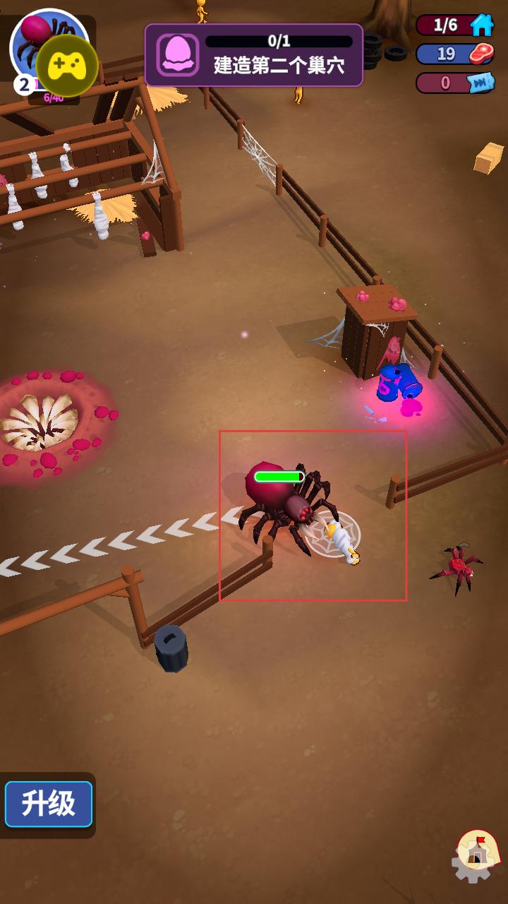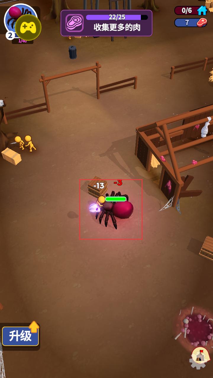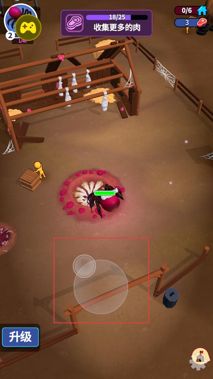 1、操控蜘蛛在場(chǎng)景中活動(dòng),需完成收集肉的任務(wù),界面會(huì)顯示收集進(jìn)度,同時(shí)可關(guān)注升級(jí)按鈕,為蜘蛛后續(xù)成長(zhǎng)做準(zhǔn)備。