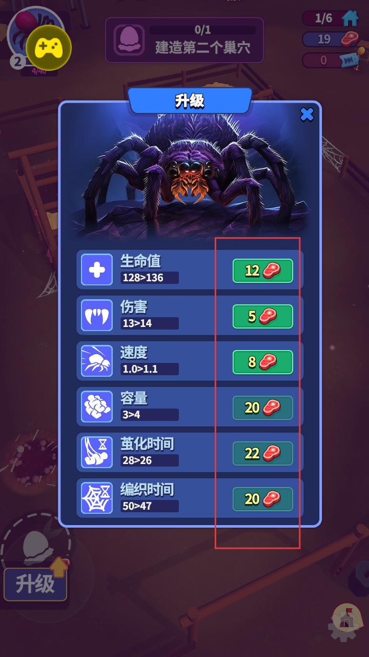 3、點(diǎn)擊升級(jí)按鈕進(jìn)入界面,可消耗收集到的肉提升蜘蛛的生命值、傷害、速度等屬性,讓蜘蛛在戰(zhàn)斗和生存上更具優(yōu)勢(shì)。