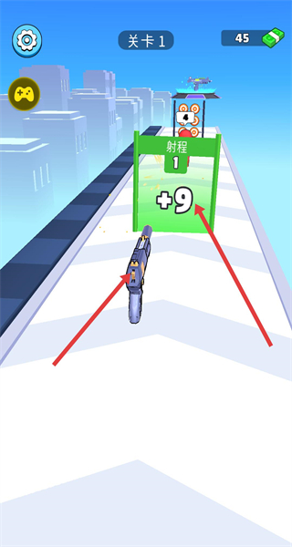 4、玩家進(jìn)入跑酷射擊關(guān)卡借助裝配后射程9增益,遠(yuǎn)距離攻擊目標(biāo)沿跑道前進(jìn)完成關(guān)卡1挑戰(zhàn)。