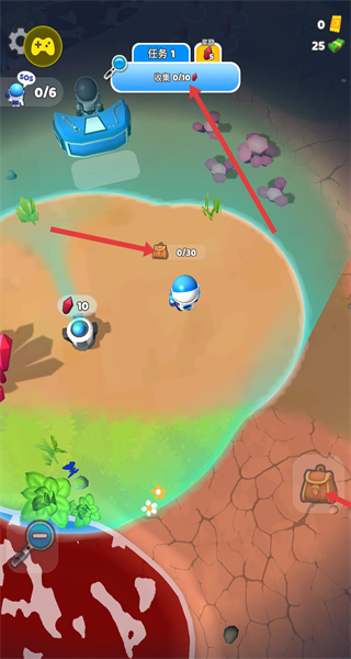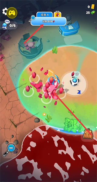 3、到達(dá)新島嶼破壞紅色晶體獲取資源,繼續(xù)完成任務(wù)1收集目標(biāo),利用背包存儲(chǔ)道具為后續(xù)升級(jí)做準(zhǔn)備。