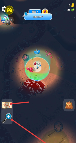 2、點(diǎn)擊左下角放大鏡擴(kuò)大地圖探索范圍,發(fā)現(xiàn)隱藏區(qū)域后縮小放大鏡精準(zhǔn)導(dǎo)航,前往新區(qū)域收集任務(wù)道具。