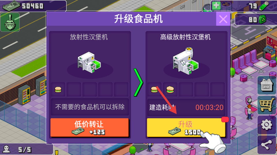 3、消耗金幣升級(jí)食品機(jī),提升漢堡制作效率與收益,助力餐廳發(fā)展。
