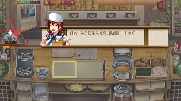 3、碗具清洗完按提示點(diǎn)擊收好,保持廚房整潔,為后續(xù)經(jīng)營(yíng)做好準(zhǔn)備。