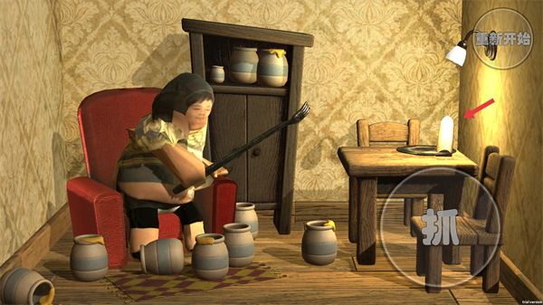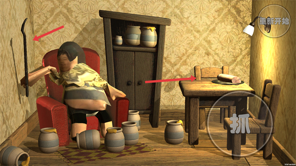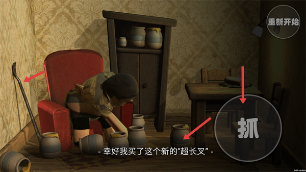 2、在場景中注意收集道具如超長叉利用右側(cè)抓按鈕進(jìn)行互動(dòng),收集罐子等物品推進(jìn)游戲進(jìn)程。