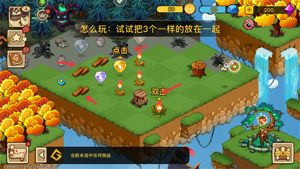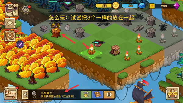3、游戲中需將三個一樣的物品放在一起點擊樹樁等物品,利用小型篝火采集魔法結(jié)晶雙擊采集可提升效率。
