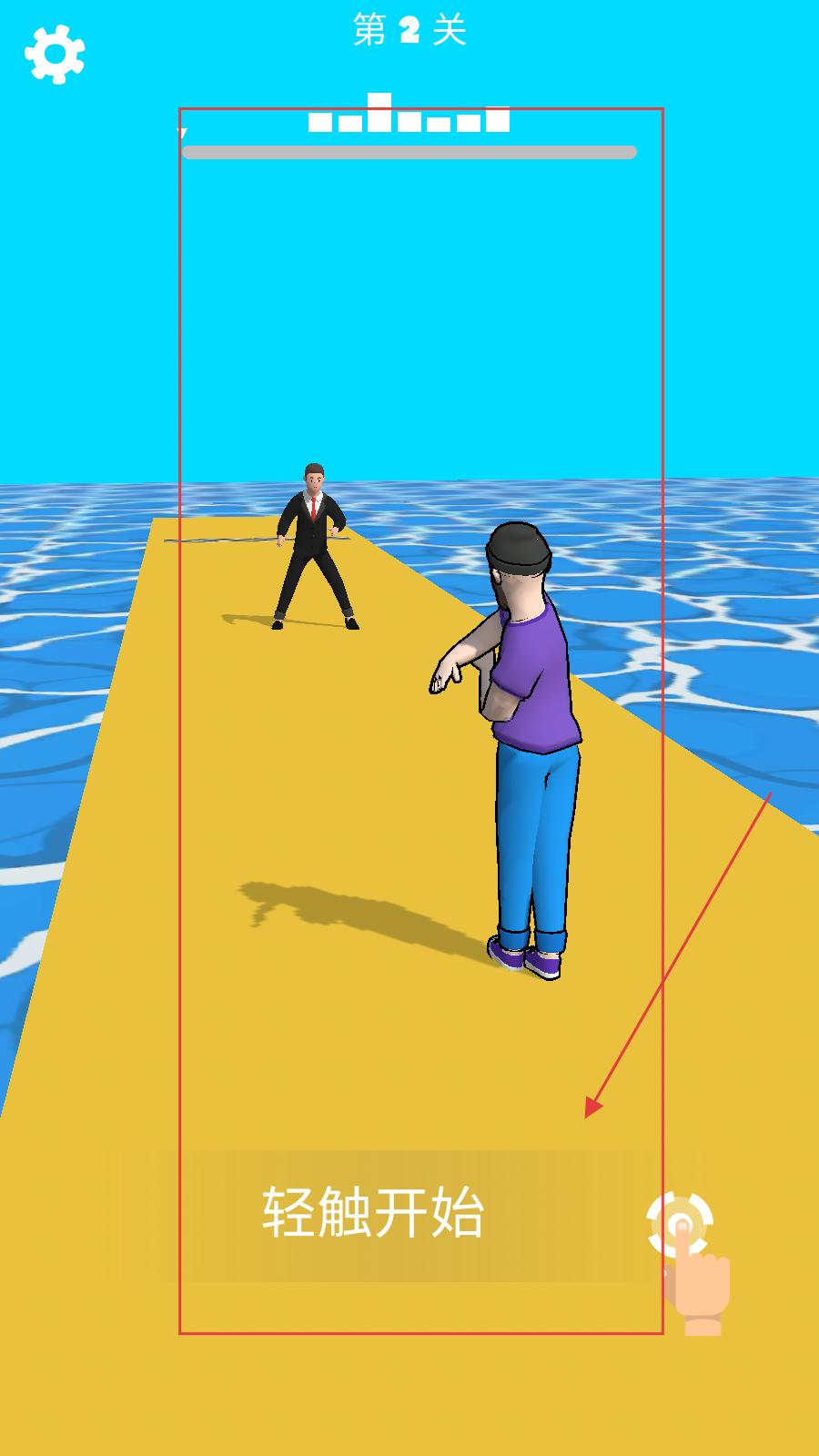 1、玩家進(jìn)人游戲,了輕觸屏幕開(kāi)始第二關(guān),操控角色在黃顏色路徑上前進(jìn),準(zhǔn)備應(yīng)對(duì)與西裝角色的戰(zhàn)斗挑戰(zhàn)。