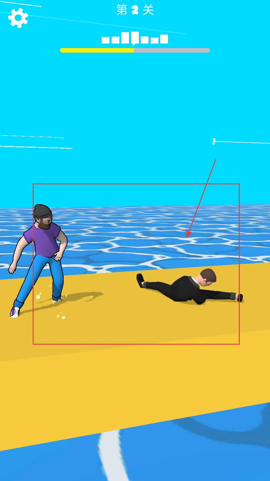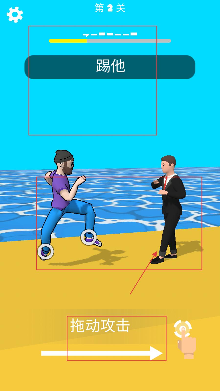 2、玩家需要拖動(dòng)自己的屏幕來(lái)控制角色攻擊,對(duì)西裝角色執(zhí)行踢擊動(dòng)作,消耗其血量,推進(jìn)戰(zhàn)斗進(jìn)程。