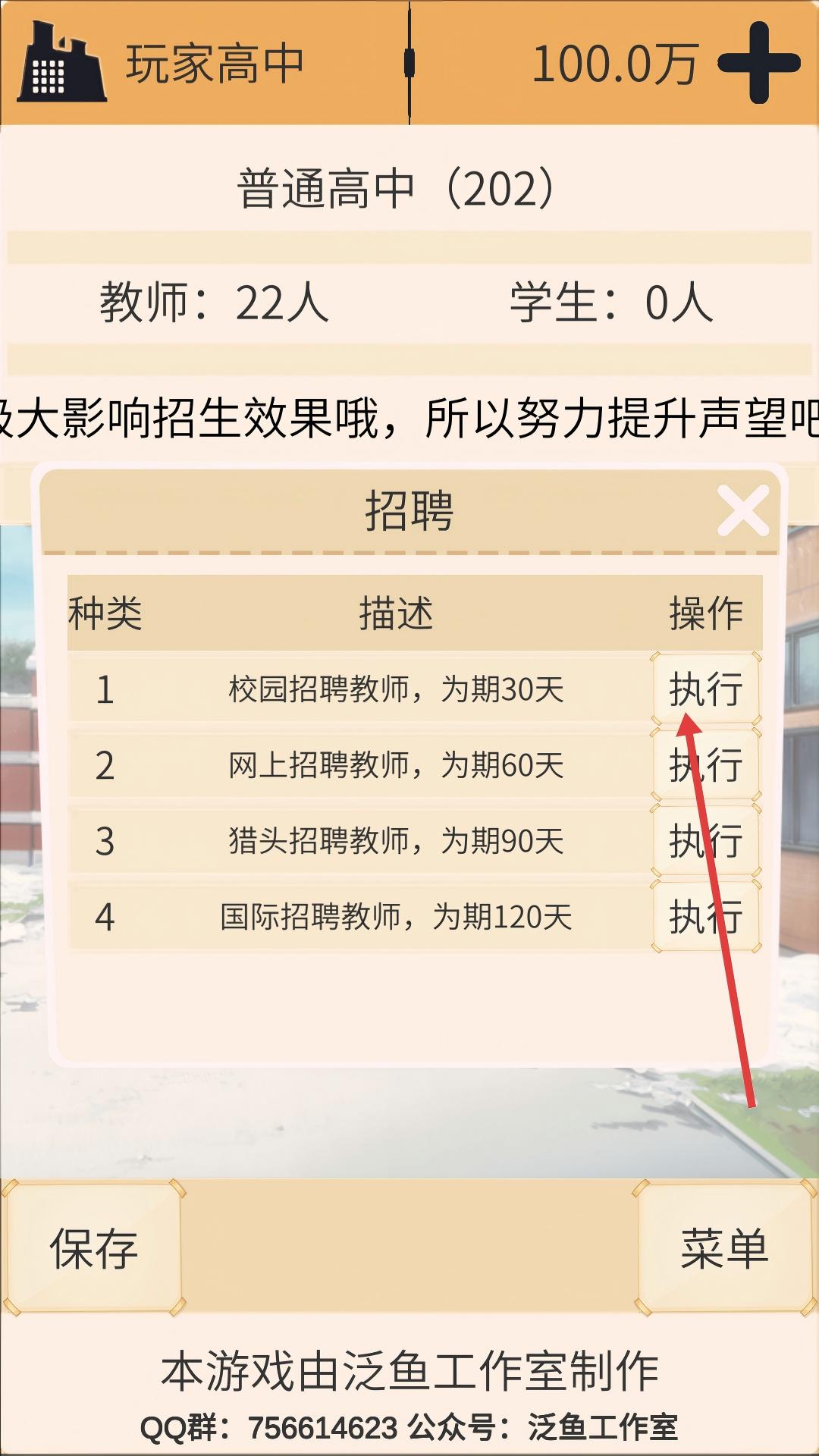 4、在招聘界面選擇合適的招聘類型并點(diǎn)擊執(zhí)行,開展教師招聘工作,這是獲取教師資源的具體操作,不同招聘類型對應(yīng)不同的招聘周期和效果。