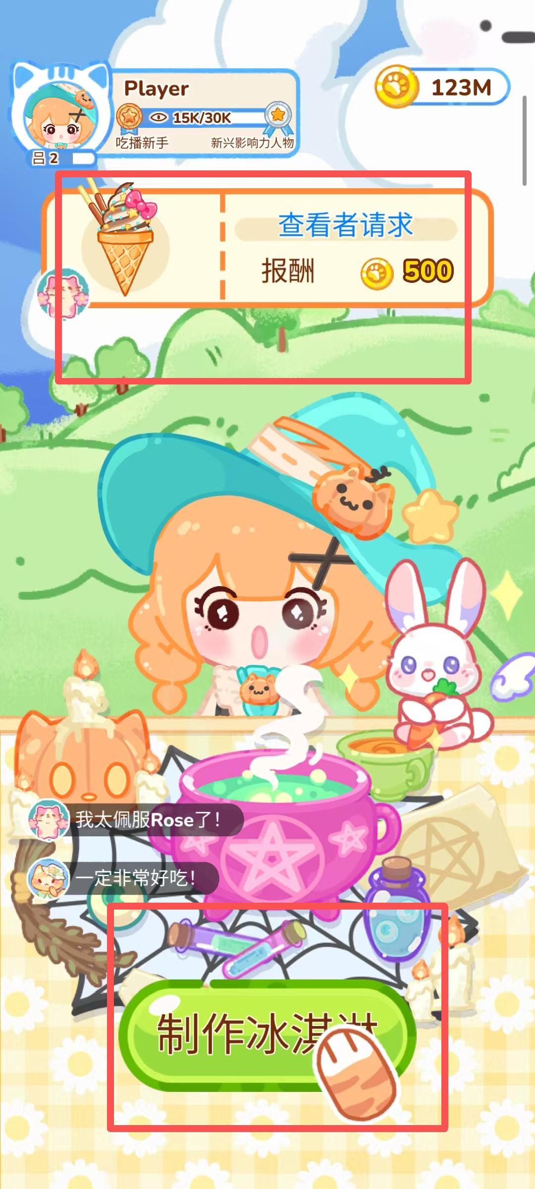 2、查看觀眾請求,根據(jù)請求點擊制作冰淇淋按鈕,完成冰淇淋制作,獲得報酬。