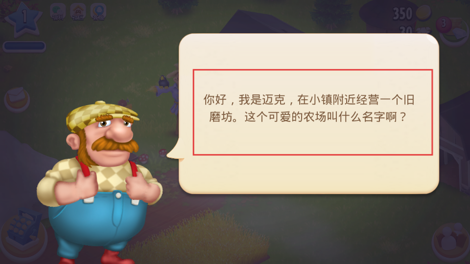 1、在農(nóng)場(chǎng)中與邁克互動(dòng),了解農(nóng)場(chǎng)的背景故事,為農(nóng)場(chǎng)經(jīng)營(yíng)開啟劇情,推動(dòng)游戲發(fā)展。