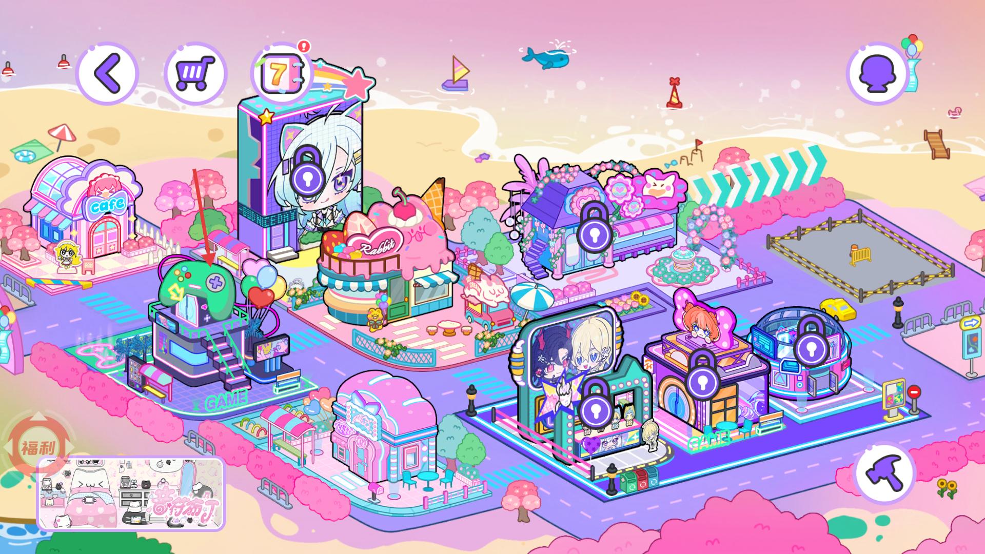 2、按箭頭提示探索不同建筑區(qū)域,如紫色造型屋等,解鎖多樣場景與互動內(nèi)容。