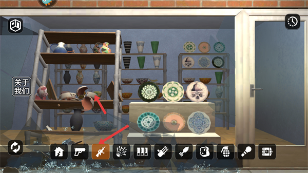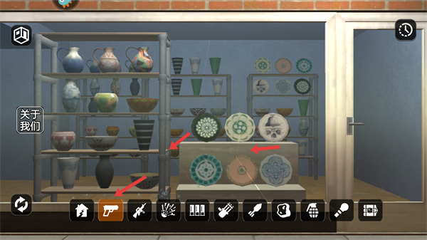 1、進(jìn)入破壞場(chǎng)景后在武器選擇界面點(diǎn)擊手槍圖標(biāo)裝備手槍武器,可擊碎目標(biāo)陶瓷開啟破壞進(jìn)程。