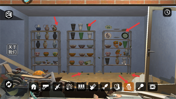 3、當(dāng)貨架上仍有大量陶瓷殘留時(shí)切換到手雷武器,爆炸可使多個(gè)貨架上的陶瓷及貨架本身受到嚴(yán)重破壞碎片散落。
