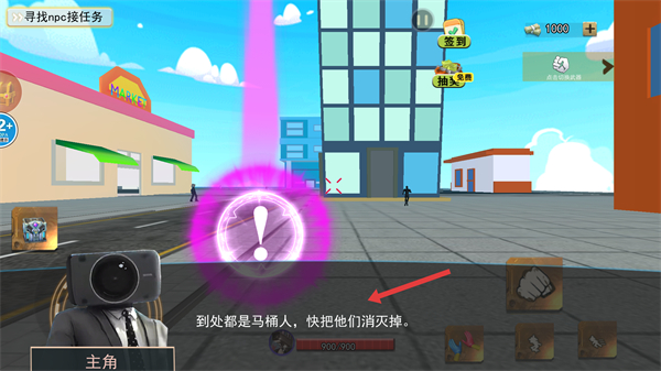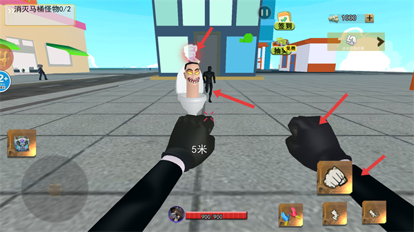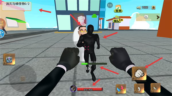 2、面對(duì)出現(xiàn)的馬桶怪物,直接使用默認(rèn)的拳頭武器發(fā)起攻擊,靠近怪物后點(diǎn)擊攻擊同時(shí)注意周?chē)霈F(xiàn)的敵人。