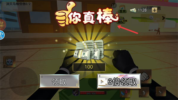4、成功消滅場(chǎng)景內(nèi)所有馬桶怪物后屏幕中央會(huì)彈出獎(jiǎng)勵(lì)界面界面上會(huì)清晰顯示基礎(chǔ)金錢(qián)獎(jiǎng)勵(lì)的數(shù)額,可選擇領(lǐng)取或3倍領(lǐng)取獎(jiǎng)勵(lì)獲得金錢(qián)獎(jiǎng)勵(lì)。