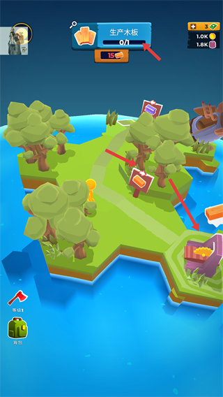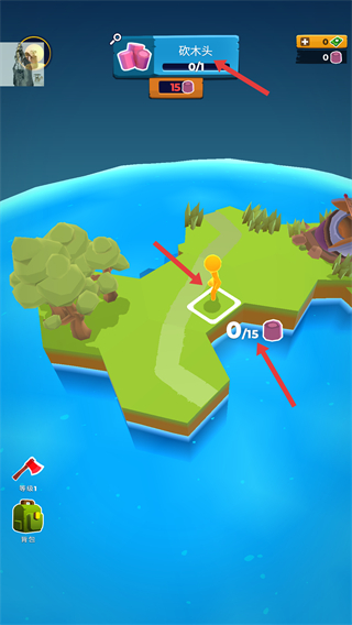 1、接取砍木頭任務(wù)操控角色前往樹(shù)木區(qū)域使用斧頭砍伐樹(shù)木,收集15個(gè)紫色資源完成砍木頭任務(wù)進(jìn)度。
