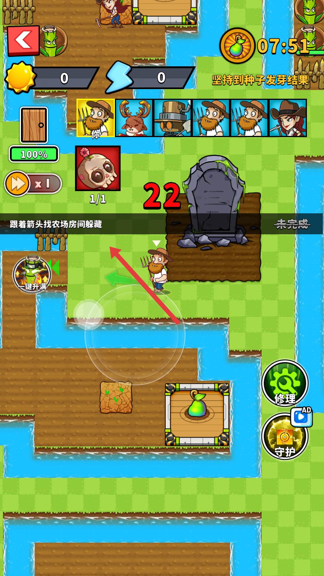 2、跟著箭頭尋找農(nóng)場房間躲藏,躲避僵尸的追擊,過程中需留意地圖布局,確保順利到達(dá)躲藏點(diǎn)。