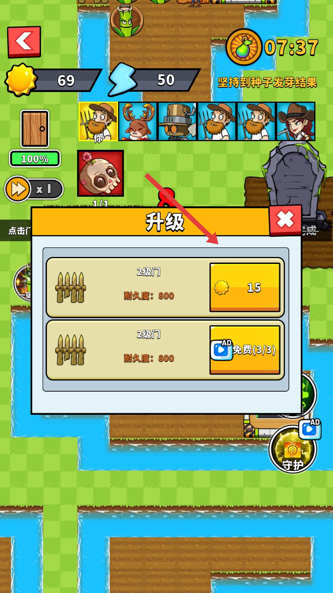 4、升級(jí)門的耐久度,提升門的防御能力,抵御僵尸的攻擊,需根據(jù)僵尸的進(jìn)攻強(qiáng)度及時(shí)升級(jí)門,保障自身安全。
