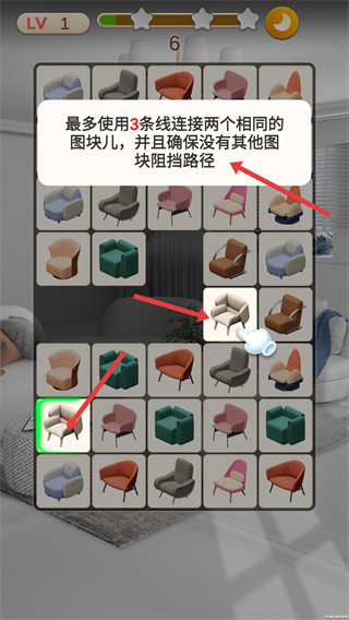 1、按照規(guī)則最多用3條線連接兩個(gè)相同圖塊且路徑無(wú)其他圖塊阻擋,點(diǎn)擊相同的椅子圖塊進(jìn)行連接開始消除操作。
