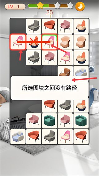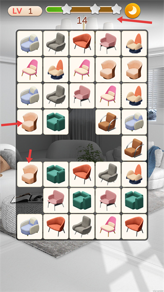 2、持續(xù)尋找可連接的相同椅子圖塊消除后關(guān)注上方分?jǐn)?shù)變化,積累分?jǐn)?shù)以提升星級(jí)推進(jìn)游戲進(jìn)程。