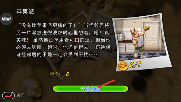 1、點擊開始游戲進入蘋果派關卡開啟干擾怪鄰居的冒險,目標是收集7枚金幣干擾鄰居的樂趣。