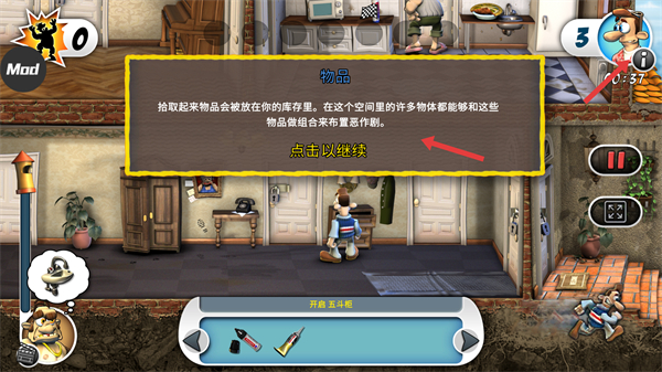 3、拾取物品會存入庫存可與場景物體組合布置惡作劇,點擊繼續(xù)了解物品使用方法合理利用物品推進任務。