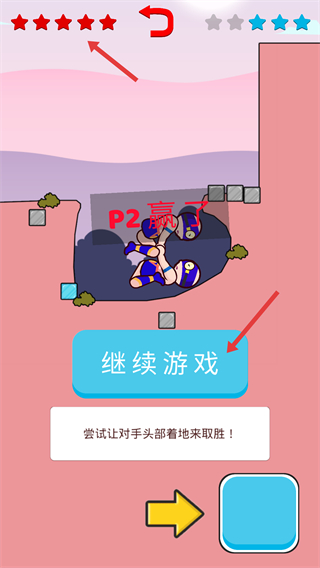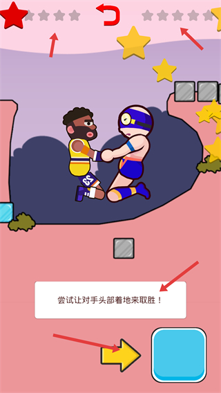 3、在摔跤過程中嘗試讓對手頭部著地來取勝,同時收集星星提升游戲評分。