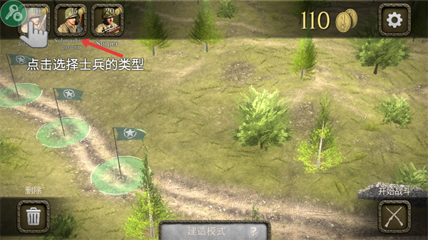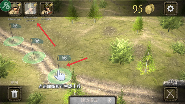 3、點擊旗幟生成士兵合理布局士兵位置,利用不同類型士兵的優(yōu)勢構建戰(zhàn)斗防線。