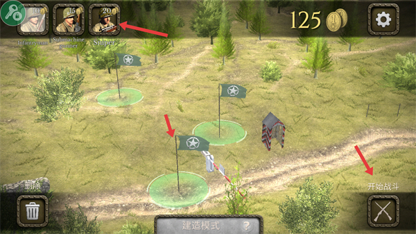 1、選擇士兵類型根據(jù)金幣和戰(zhàn)場需求部署士兵,布局好后點(diǎn)擊開始戰(zhàn)斗開啟二戰(zhàn)戰(zhàn)場對決。