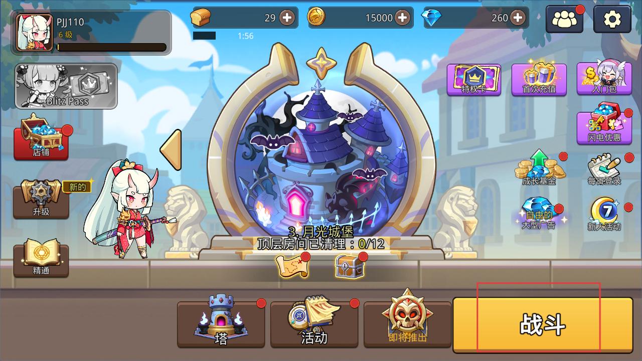 1、進(jìn)入游戲主界面,選擇月光城堡,點(diǎn)擊戰(zhàn)斗按鈕,開(kāi)啟橫版動(dòng)作冒險(xiǎn),在隨機(jī)生成的地圖中探索戰(zhàn)斗,體驗(yàn)roguelike元素的樂(lè)趣。