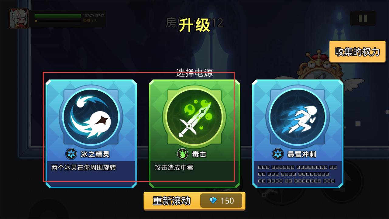 2、升級(jí)時(shí)出現(xiàn)選擇電源界面,可挑選冰之精靈、毒擊等技能,不同技能帶來(lái)不同戰(zhàn)斗效果,為角色培養(yǎng)和策略組合提供更多可能。