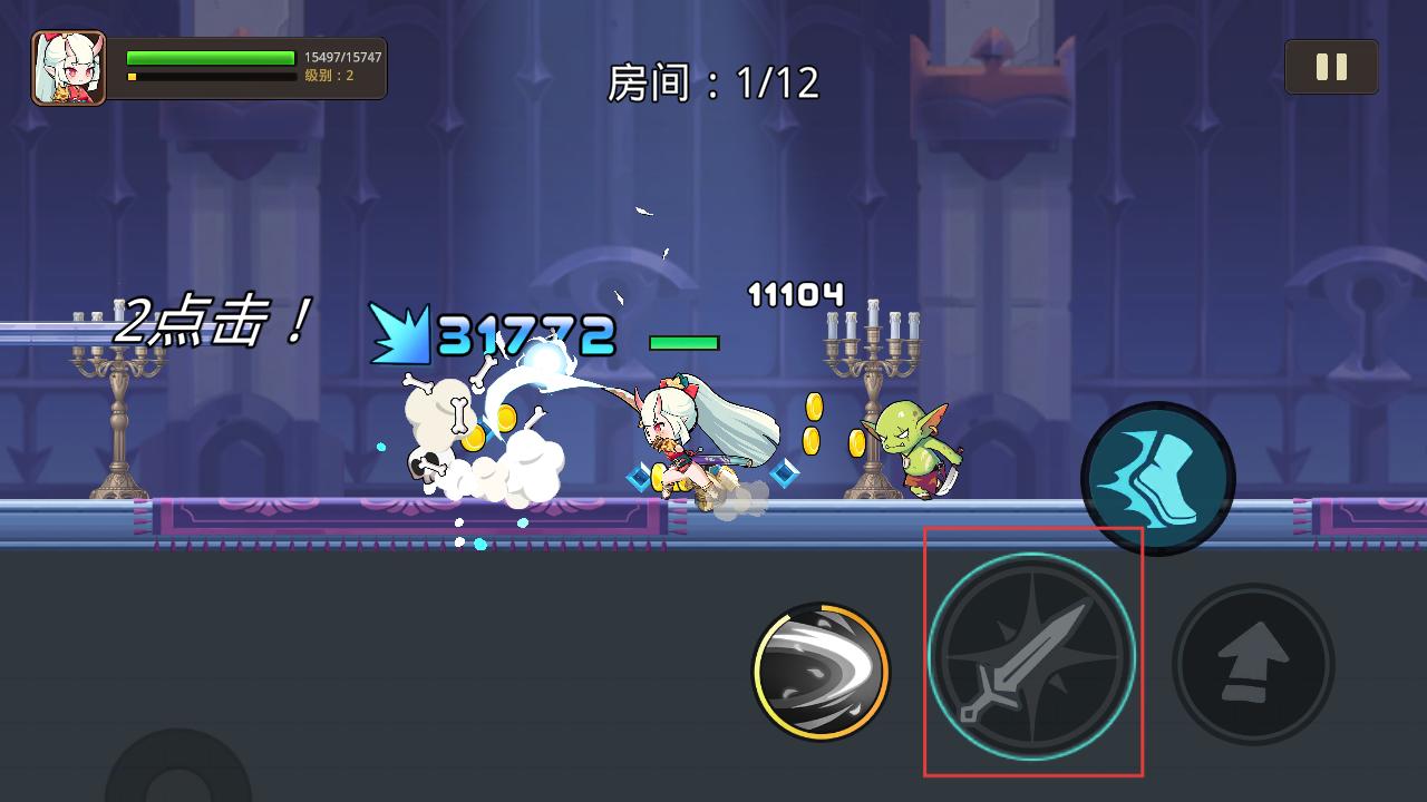 3、戰(zhàn)斗中處于房間1場(chǎng)景,點(diǎn)擊攻擊按鈕發(fā)起進(jìn)攻,擊敗怪物獲取金幣,推進(jìn)房間進(jìn)度,感受連招機(jī)制帶來(lái)的打擊感和策略性。