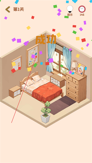 3、每關(guān)需在規(guī)定時間內(nèi)完成家具布置和房間裝修,同時可利用提示功能輔助完成,根據(jù)引導(dǎo)放置相應(yīng)位置。