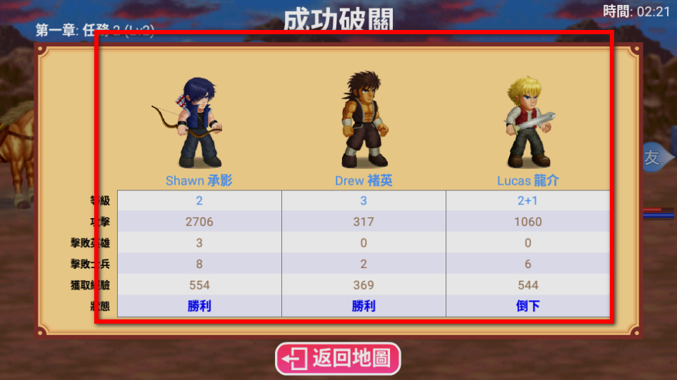 4、成功破關(guān)可查看英雄的等級、攻擊等戰(zhàn)斗數(shù)據(jù),獲取經(jīng)驗提升等級,點擊返回地圖可繼續(xù)挑戰(zhàn)其他任務(wù)。