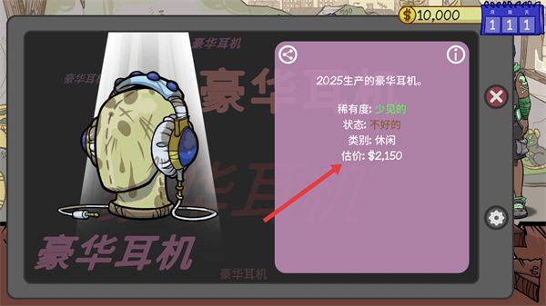 3、查看物品時可了解其生產時間、稀有度、狀態(tài)、類別和估價,比如豪華耳機有這些詳細信息。