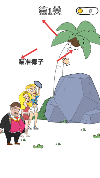 2、進入第1關瞄準椰子調整好角度和力度點擊投擲工具,嘗試擊落椰子開啟本關的挑戰(zhàn)任務。